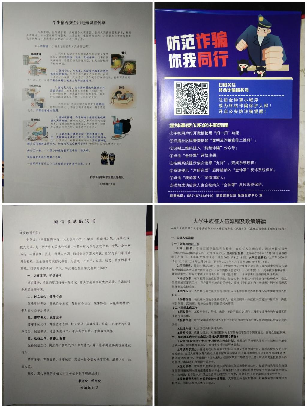 19、20级学生宿舍,向同学们宣传大学生应征入伍流程及政策、诚信考试、防范诈骗和宿舍安全用电等知识。