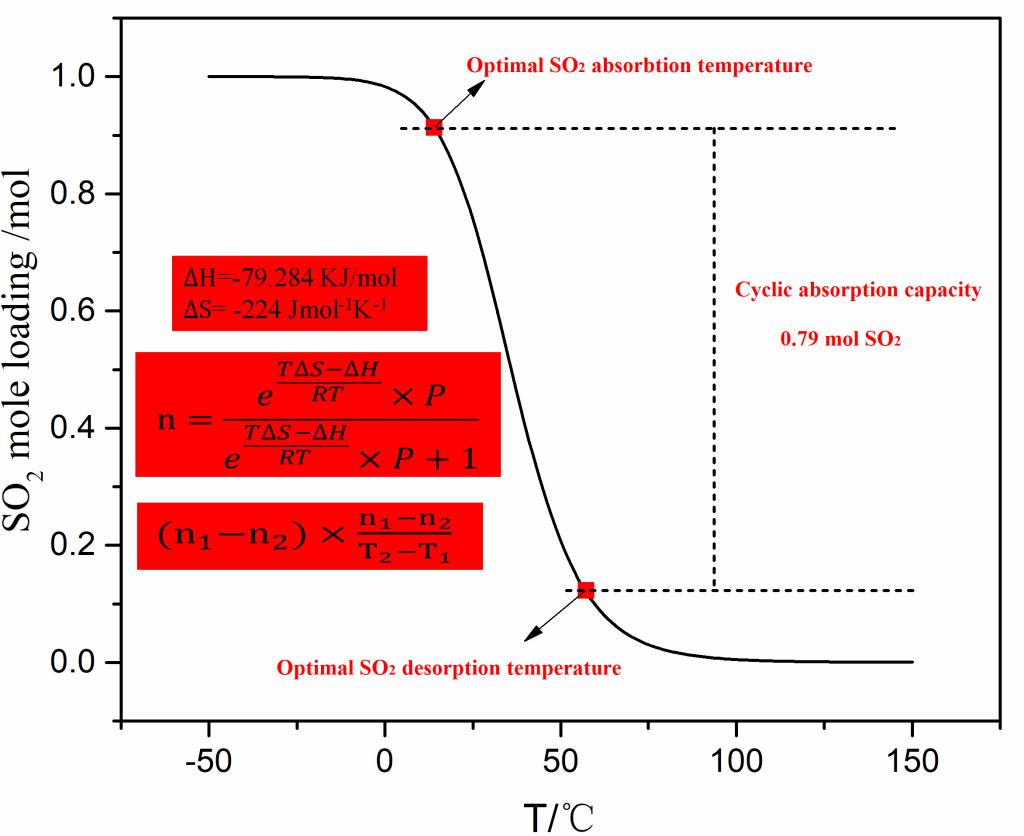 另外课题组通过两步反应合成了一种低粘度、高热稳定性的二丁基-(1,1-二甲基-3,3,3-三苯基-二硅氧烷基甲基)-胺(DDTDA)。发现其与SO2的反应焓和熵变分别为-85.39 KJ/mol和-244 J mol-1K-1,其绝对值相比于DPSA得到进一步增加。数学实验证明,简单地比较两种吸收剂在一定温度下的容量来评估它们的吸收性能是不科学的。不同的吸收剂具有不同的最佳捕集温度范围,该范围由其反应焓变和熵变决定。相关研究成果以“A standard function to evaluate optimal absorption and desorption temperature of SO2absorbent: Taking amine alkyl organosilicon as example”为题发表在化工领域国际Top学术期刊Separation and Purification Technology上(论文链接://doi.org/10.1016/j.seppur.2022.120634)。论文第一作者为糖心vlog
