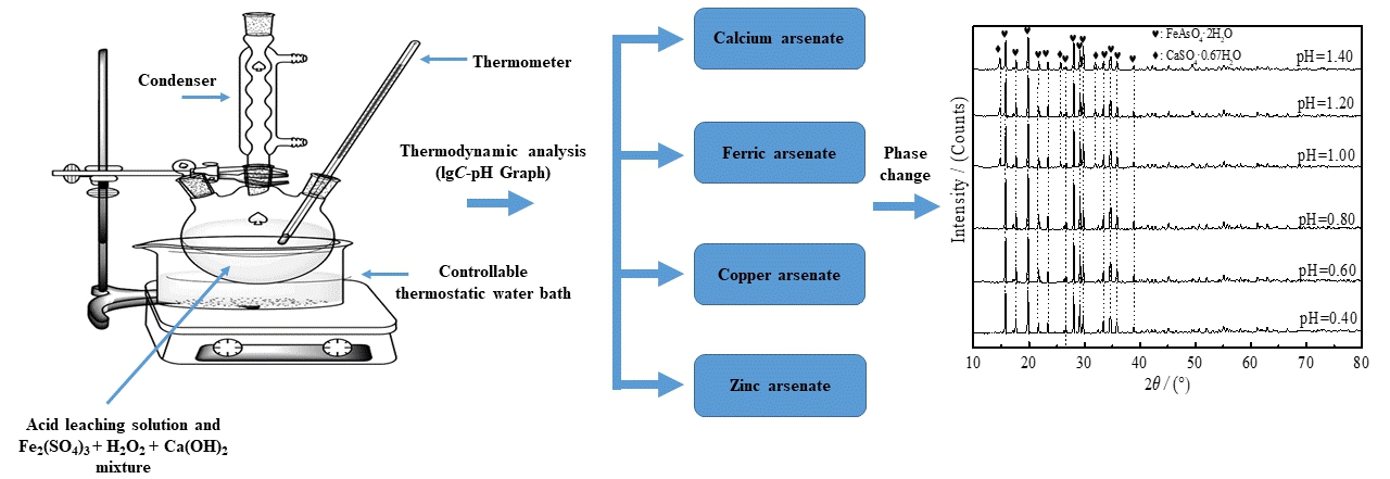 夏举佩教授课题组提出利用冶炼烟气洗涤酸为酸浸介质对其进行初步分离,然后采用共沉淀和分步沉淀技术回收有价元素。该方法不仅可实现洗涤酸的资源化利用,而且可回收酸中的稀贵金属。研究发现白烟尘经酸浸后,砷以AsO43-和AsO33-的形式与Cu2+和Zn2+等共存于液相中,因此探索有效途径对以上金属进一步分离具有重要意义。