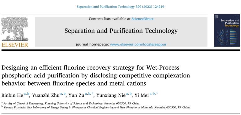 上述研究成果以《Designing anefficient fluorine recoverystrategy for wet-process phosphoric acid purification by disclosing competitive complexation behavior between fluorine species and metal cations》为题发表在化工领域TOP学术期刊《Separation and Purification Technology》上。糖心vlog