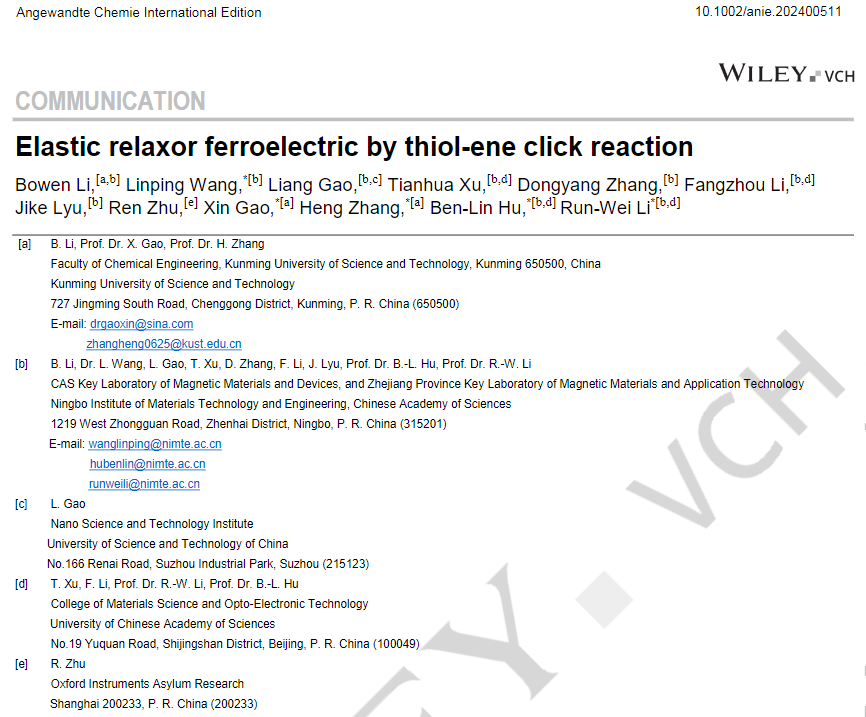 张恒正高级实验师课题组和中国科学院宁波材料技术与工程研究所柔性磁电功能材料与器件团队合作,在铁电材料弹性化领域取得重要研究进展,相关成果以“Elastic relaxor ferroelectric by thiol-ene click reaction”为题发表在国际化学顶级期刊《Angewandte Chemie International Edition》上。糖心vlog