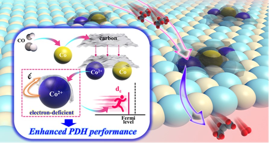 近年来,丙烷直接脱氢(PDH)反应被认为是最有前景的丙烯生产工艺之一,基于页岩气资源禀赋,云南省发展和改革委员会等多部门在《云南省新材料产业发展三年行动(2022-2024年)》中将丙烷脱氢催化剂的研发明确为重点任务之一。在PDH反应中,碳-金属结合能通常被认为是预测烷烃活化过程中碳氢键吸附能的描述符,并且与金属的d带中心相关。基于此,罗永明教授和何德东教授团队巧妙利用一氧化碳在金属钴上的歧化反应及其原位产生的碳层来调控活性Co(II)的电荷密度。相关实验和理论计算结果表明,预沉积的碳层降低了四面体Co(II)的电子密度,使其d带中心更接近费米能级,有利于丙烷脱氢反应中速控步骤C-H的活化。本研究为碳物种调控活性金属的电子环境和开发高性能钴基PDH催化剂的研究提供了新的学术视角,是罗永明教授和何德东教授团队继Nat. Commun., 14, 100, 2023后的又一项重要研究成果。