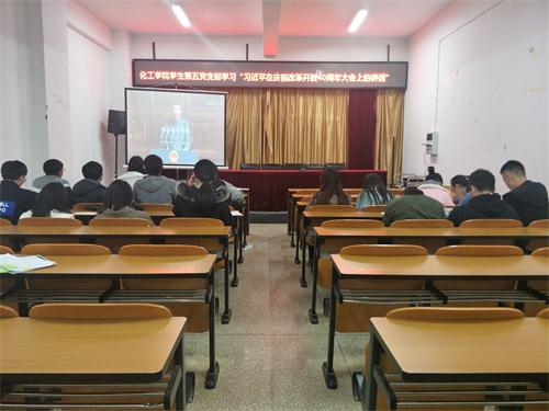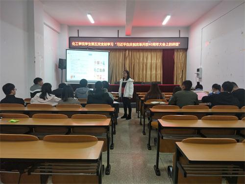 学生第五党支部在化工楼负一楼报告厅组织开展了关于学习习近平总书记在庆祝改革开放40周年大会上的讲话的活动。学生第五党支部负责人罗晓菲老师出席了此次活动,第五党支部全体正式党员及预备党员参加了本次活动。