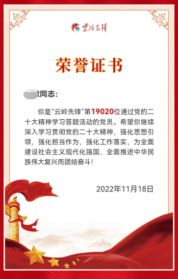 学生第三党支部还积极依托学习强国、云岭先锋、QQ、微信等媒介宣传、学习党的二十大报告中的最新论述。2022年11月15日至11月28日,党支部组织支部成员自觉学习党的二十大精神,通过“云岭先锋”完成“党的二十大精神答题活动”,支部29名成员均完成了20组共计100题的答题竞赛活动,并取得了答题活动荣誉证书。
