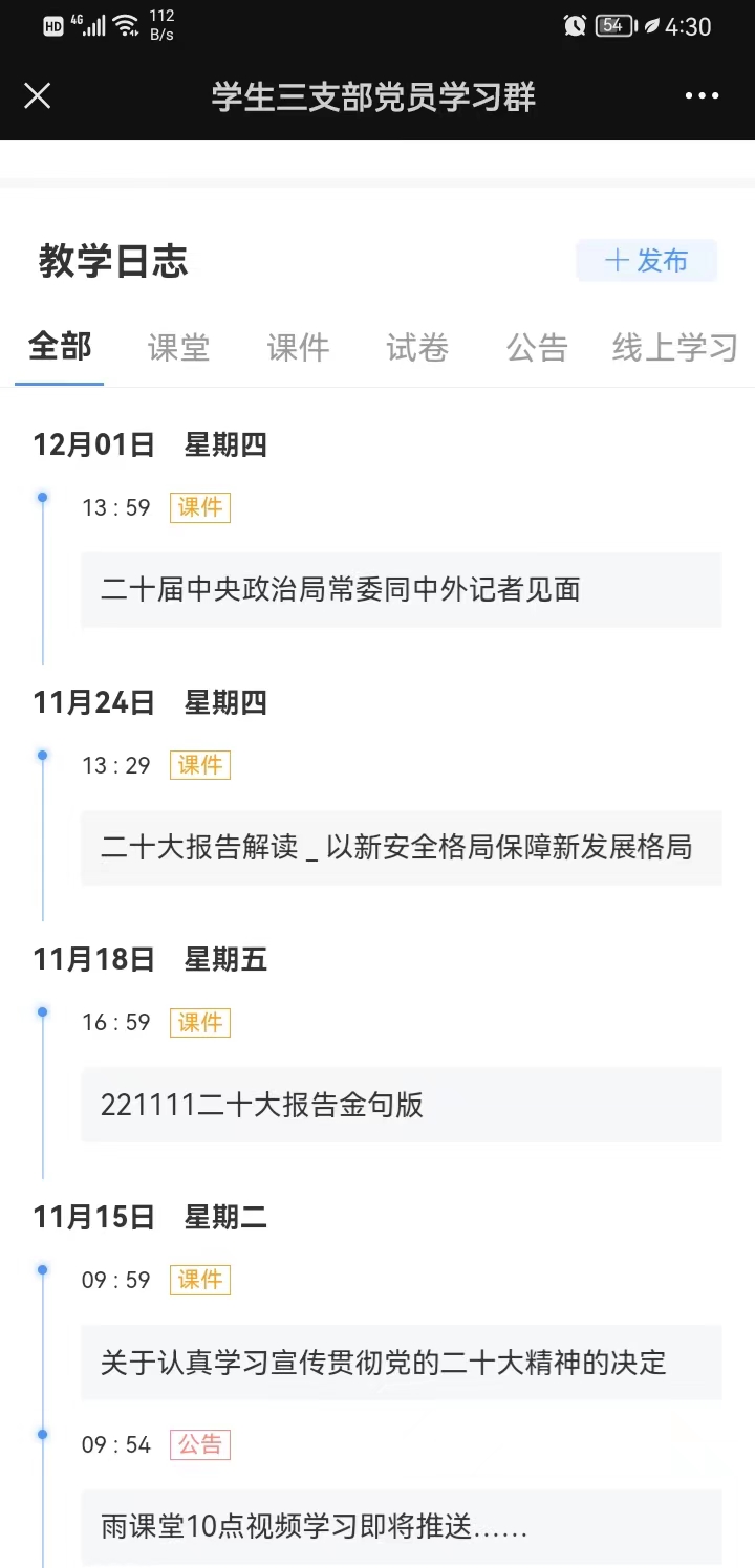2022年11月,党支部依托“雨课堂”网络教学平台,组织党员每周四下午进行线上专题学习,内容涵盖《中共中央关于认真学习宣传贯彻党的二十大精神的决定》《习近平总书记在二十届中央政治局常委同中外记者见面时的讲话》《以新安全格局保障新发展格局》《二十大报告金句》《科教兴国 人才强国》等,并要求党员、入党积极分子结合学习党的二十大精神,撰写心得体会,形成思想汇报。