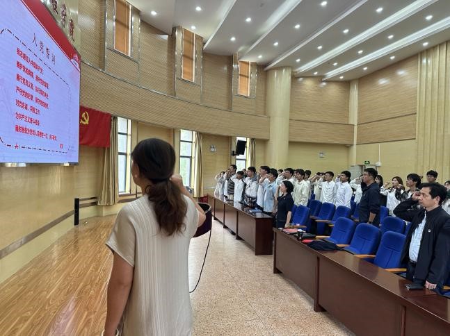 庆祝大会在雄壮的国歌声中拉开帷幕,李云燕书记宣读新接收的预备党员名单,并作为领誓人带领预备党员进行入党宣誓,党员重温入党誓词,全体党员面向党旗,紧握右拳,庄严宣誓。