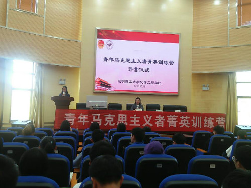在化工楼100报告厅举行2018年“青年马克思主义者菁英训练营”开营仪式。院党委副书记李云燕老师、院团委李凯宇老师、学工办杨欢老师与全体训练营成员一同参与。