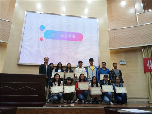 首先,青协全体志愿者起立合唱《青年志愿者之歌》。随后播放了7分钟的回忆视频。会长致辞总结了一学年的收获与不足之处,并鼓励协会志愿者们以后健康发展,不忘初心,表达了对协会全体志愿者的美好祝愿。其后,伴随着激昂的音乐,第六届干部及部委都分别上台领取了聘书,随后,大会进入考核汇报竞选阶段。竞选环节过后,秉承公平公正的原则,全体志愿者对竞选人员进行了现场投票。会终金雯老师上台进行大会总结发言。在大会结束后大家拍了最后一次的集体合照。
