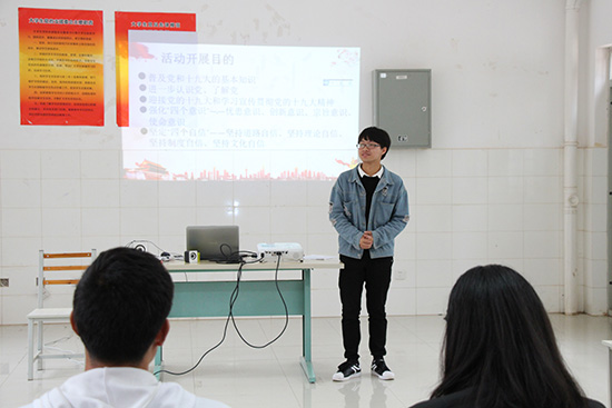 紧接着就是考验记忆力的知识竞赛,以自愿参赛、随机抽点、攻擂守擂的方式进行,同学们都积极参与,答题声、讨论声不绝于耳,最终王勇成赢得了胜利,班长赵晓艳为他送上奖品。最后,班长对本次活动作出了总结,她号召我们积极主动学习贯彻党的十九大精神,将新思想新理念落实到我们的学习生活中,并对我们以后的学习提出了明确要求,强调了需要特别注意的事情。至此,活动圆满结束。