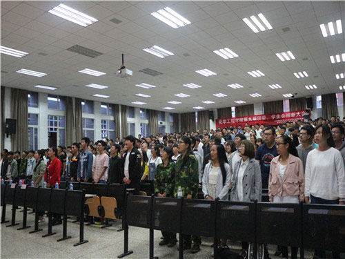 第四项议程学院学生会主席赵茁森发言,主席代表第九届团委、学生会对新生们做团委、学生会的工作汇报,从组织建设、科技与创新创业、学生维权、文体活动四个方面总结第八届团学工作。第五项议程各部门展示,各部门的部长们在讲台上为同学们介绍了自己部门的特色,从团委、学生会、“青韵化蝶”舞蹈队到青年志愿者协会,各具特色的讲述让同学们早已心有所属,低头认真的填写报名表。并按照大屏幕示意图将报名表交至指定的地方等待紧张的初试环节。随着初试的完成本次招新大会顺利结束。