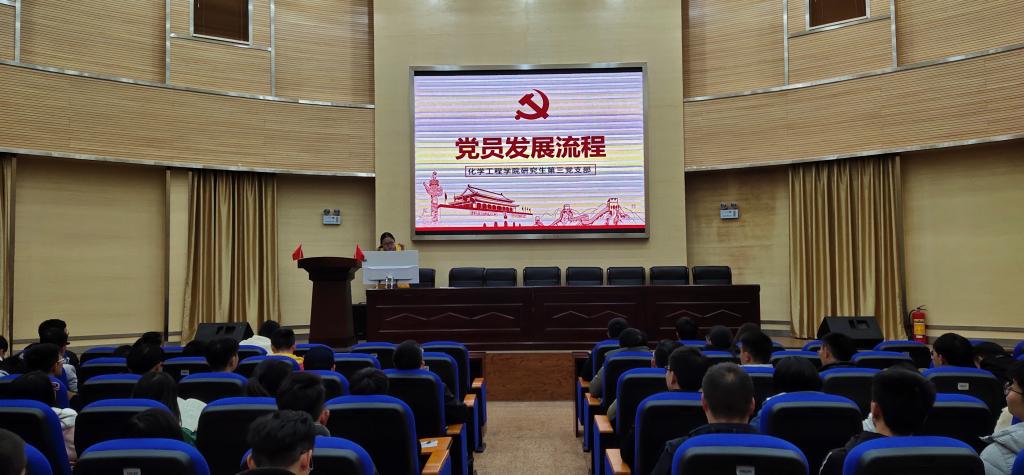 2019年12月11日晚上7:00,化工学院研究生第一、二、三党支部于化工楼100报告厅开展“为大家讲解党员发展程序相关问题”培训。大会由第三党支部书记江梦同志主持,参会人员有第一党支部书记韩涛同志、第二党支部书记母维宏同志、第三党支部书记江梦同志以及全体入党申请人和入党积极分子。