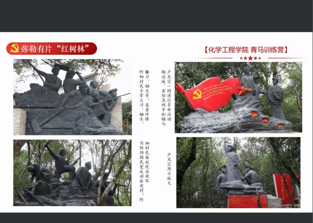 陈朔同学讲到,在红河州弥勒市西一镇中和铺村,有一片“红树林”。中和铺村是彝族阿细人的聚居村落。中和铺村有15位以卢光宗为代表的烈士在游击革命斗争中英勇牺牲。为了纪念那段历史和那些烈士,2020年8月,当地政府着手建设中和铺红色教育基地,并于年底完工。该基地主要由村口景点及村中的小树林构成,村中的小树林是整个基地的核心部分。雕刻着“中和铺村--西山革命根据地民兵指挥部旧址”的大石头也便放置于树林的入口处。阿细村民奋起伏击敌军的雕塑、烈士慷慨赴死的雕塑等元素星罗棋布,这片树林被红色元素赋予了特殊的意义。