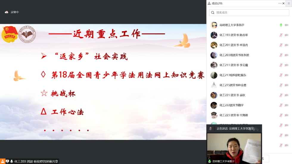 于线上开展了2023年第一次团支书工作总结交流会,会议由化工学院团委副书记杨俊婷同学主持,院团委书记李凯宇老师以及学院团学骨干及各班团支书参加了此次会议。