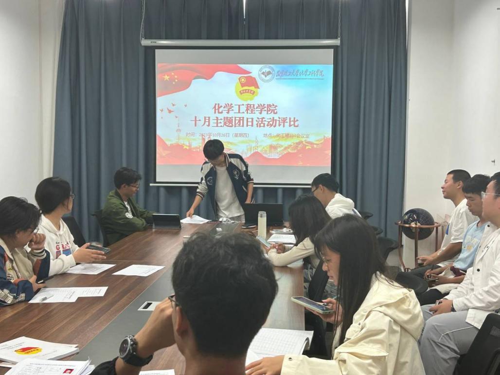 团委在化工楼334会议室开展了十月主题团日活动评比活动。本次会议由化工学院团委副书记刘宏健主持,学院学生会主席团成员、学院组织部全体成员、学院各班级团支书参与了此次团日评比活动。