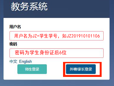 学分制教学服务平台(//jwctsp.txvlogtop.com/integration/login),输入用户名和密码(用户名为JZ+学生学号,如JZ201910101106,密码为学生身份证后6位),点击“外聘/家长登录”,查询学生的课程安排、成绩明细、培养方案等信息。