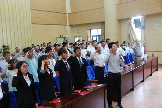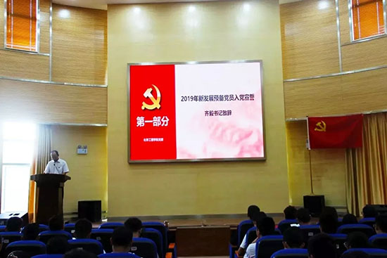 大会共分两个议程,第一项议程:2019年新发展预备党员入党宣誓。首先全体成员起立奏《国际歌》;然后齐毅书记致辞,希望党员同志们要“坚定信念、牢记使命、勇担重任、争做模范、投身实践、为党争辉”;紧接着在王修武老师的带领下进行预备党员入党宣誓、党员重温入党誓词;随后预备党员代表胡婷婷同学上台发表入党感言,表明在接下来要全心全意为人民服务,发挥党员先锋作用,把先进性落实到行动中,树立终身学习的观念。