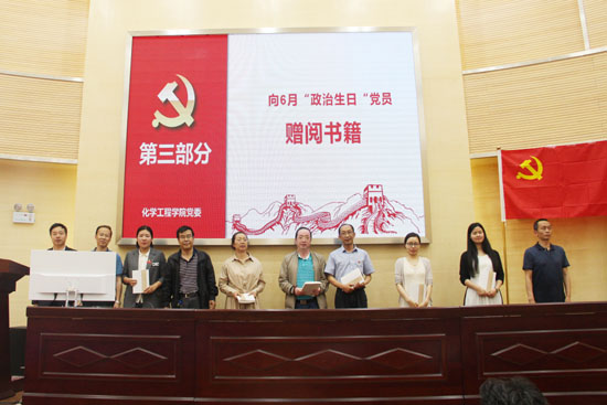 活动开始由党委李云燕副书记为大家介绍化工学院党委“党员政治生日”活动。随后开展“七个一”活动中的赠送一本书籍活动,让本月入党的同志感受党组织的关怀和温暖。最后,院党委齐毅书记发表了“如何做一个合格的共产党员”有关“责任的心,诚实的心,感恩的心”的生日感言,并带领大家完成一次理论学习。他提出过“政治生日”很有意义,既增强了对党组织的归属感,又能感受到肩上的责任,每名党员“组织入党”一生一次,“思想入党”一生一世,加强党性修养是一辈子的事。广大党员应该记住自己的政治生日,不忘初心,牢记使命,发扬党员的先锋模范带头作用。