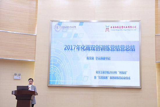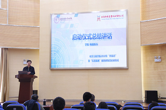 2018年4月12日下午13:30, 2018年“科技月”暨红塔蓝鹰双创训练营启动仪式在化工楼100报告厅顺利拉开帷幕。云南红塔蓝鹰纸业有限公司朱自忠总经理、院党委齐毅书记、梅毅院长、院党委李云燕副书记、生物质工程系系主任彭林才老师、生物质工程系朱正良老师、学院科研秘书张恒老师莅临现场与训练营营员们共同参与活动。