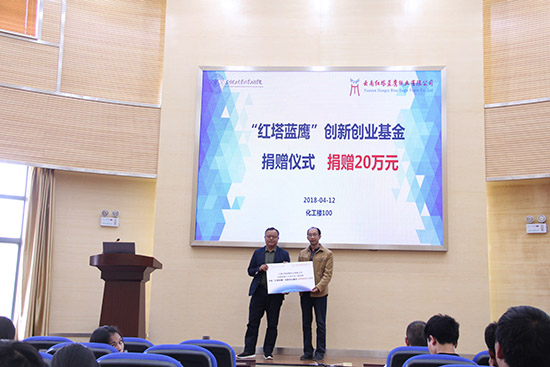 接下来进行了红塔蓝鹰创新创业基金捐赠仪式,朱总经理代表企业捐赠20万元,齐书记代表学院接受捐赠。这些基金将为化工学院搭建更好的助研平台,可以让更多的学生参与到助研项目中,以便获得更多知识。