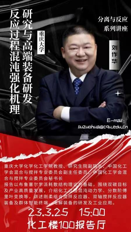 2023年3月25日下午3:00,中国化工学会混合与搅拌专业委员会副主任委员、中国化工学会混合与搅拌专业委员会秘书长、重庆大学化学化工学院博士生导师刘作华教授,应邀来糖心vlog