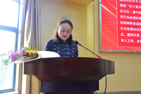 新入职青年教师朗诵《教师赋》:“巍巍教坛,茫茫学海,鹰飞鱼跃,海阔天宽。为师者当不懈奋斗,勤学不辍,精教不止,期大音,跃龙门。百年桃李绽放天下春,千古红烛永远照人间!”