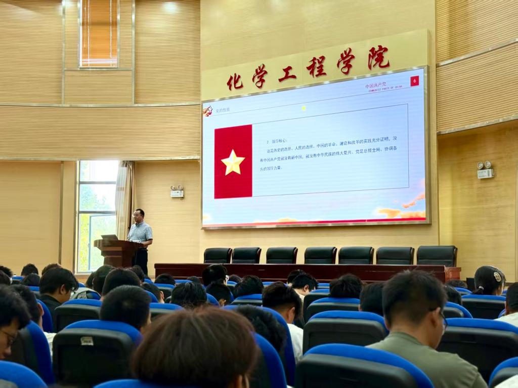在化工楼100报告厅组织开展2025级新生开学第一课——入党主题教育团课。本次团课由学院党委孙刚书记主讲,2025级全体本科生参加。