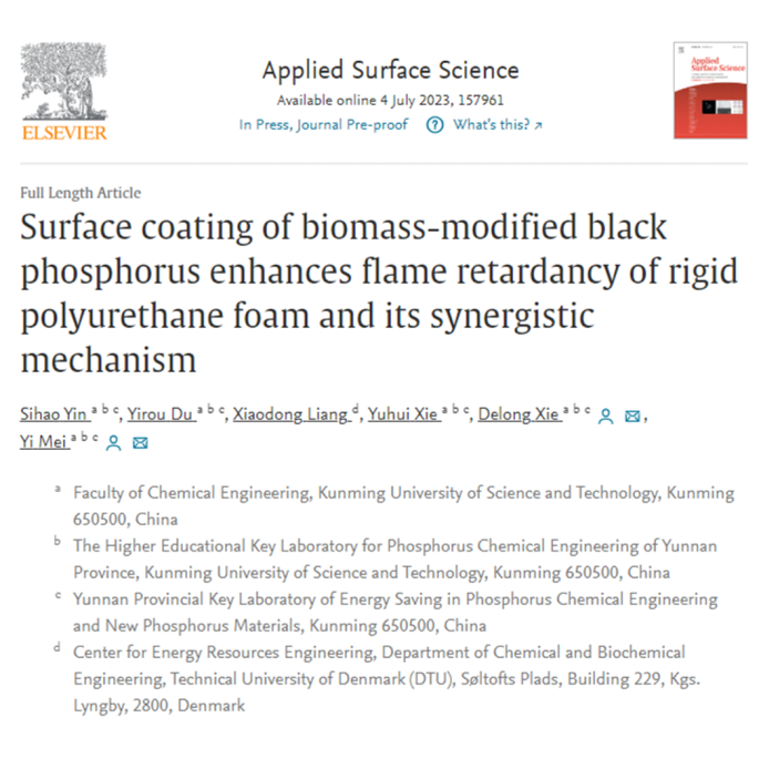 为论文第一署名单位,实验室梅毅教授和谢德龙教授为论文共同通讯作者,博士生尹思浩为论文的第一作者。研究工作得到国家自然科学基金、云南省磷化工节能与新材料重点实验室、云南省重点研发计划项目、云南省高校磷化工重点实验室以及云南省教育厅科学研究基金的资助。
