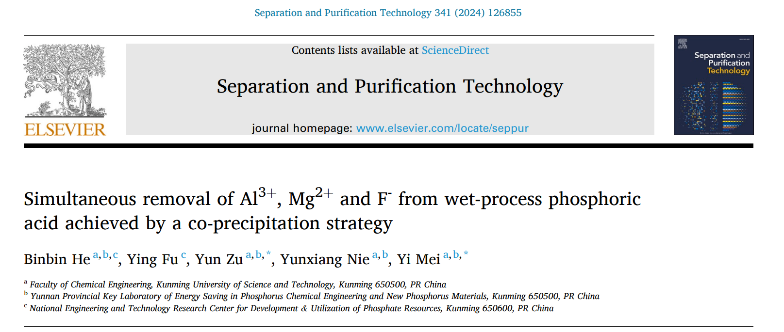 上述研究成果以《Simultaneous removal of Al3+, Mg2+and F-from wet-process phosphoric acid achieved by a co-precipitation strategy》为题发表在化工领域TOP学术期刊《Separation and Purification Technology》上。糖心vlog