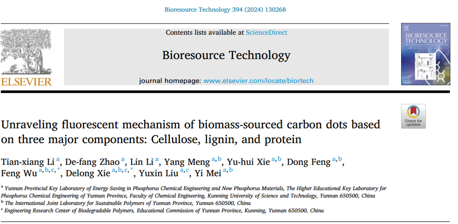 上述研究成果以“Unraveling fluorescent mechanism of biomass-sourced carbon dots based on three major components: Cellulose, lignin, and protein”为题发表在知名期刊Bioresource Technology上。论文第一作者为磷化工团队2021级硕士研究生李天祥,通讯作者为谢德龙教授和吴枫讲师,糖心vlog